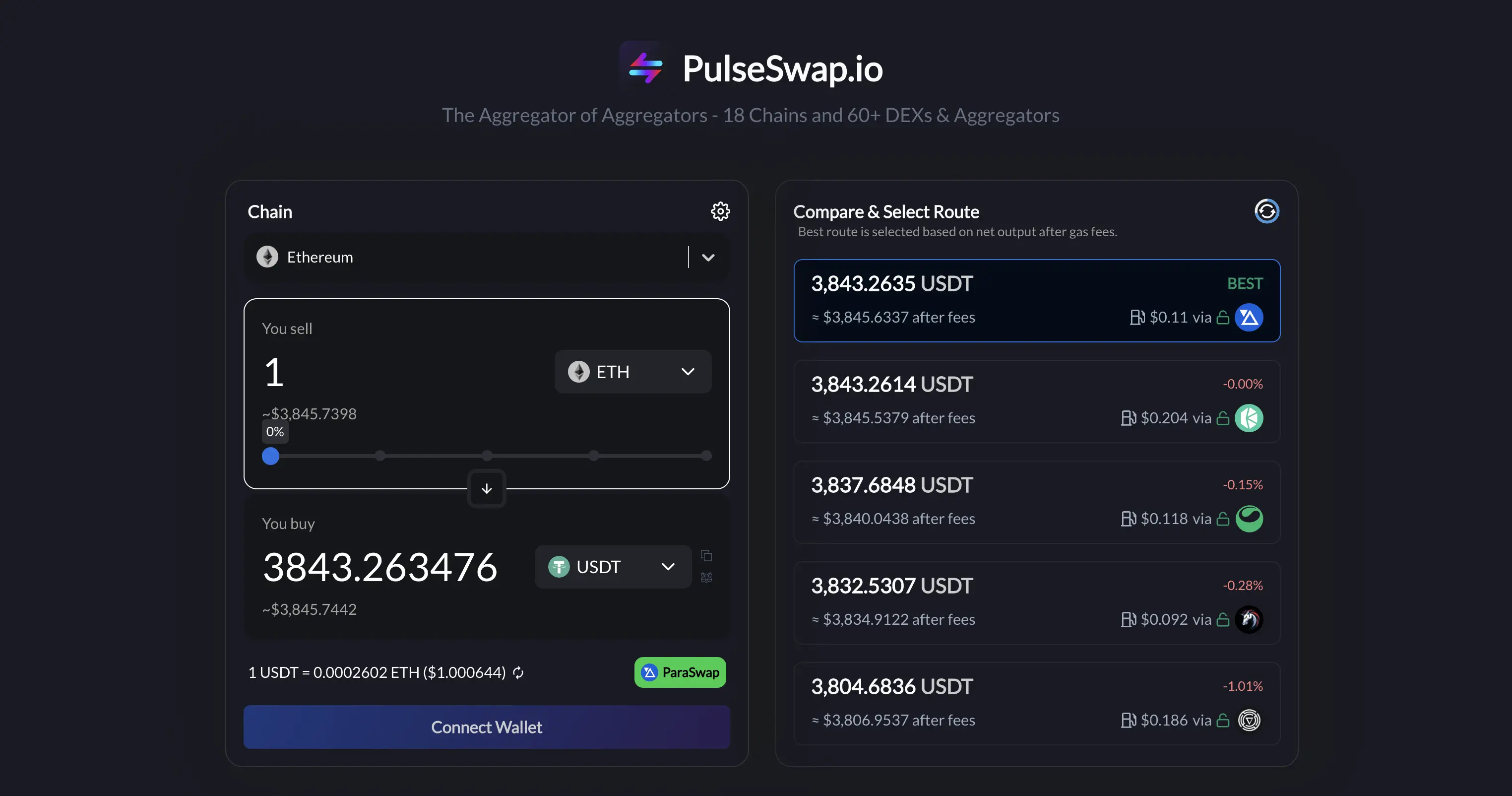 Während die DeFi-Landschaft weiter wächst, bringt eine Plattform die Aggregation auf die nächste Stufe. PulseSwap.io baut auf dem Erfolg der unten aufgeführten führenden DEX-Aggregatoren auf, indem sie alle in einer einzigen Oberfläche zusammengefasst werden. Anstatt die Preise für 1inch, CoW Swap, ParaSwap, Rubic und andere manuell zu vergleichen, scannt PulseSwap sie alle gleichzeitig, um die besten Swap-Raten zu jedem Zeitpunkt zu liefern.